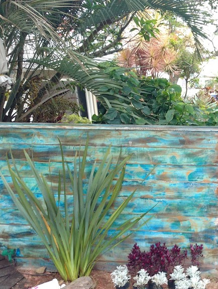 Madeiras recicladas de demolição + sinais feitas a mão + areia, conchas e pedras + mix de plantas ambientam o exterior da loja criando um canteiro que oferece alimento e refugio para fauna nativa e criando consciencia nos visitantes do centro.