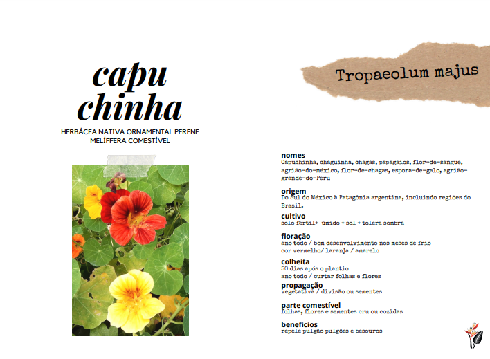 Escolhi então as CAPUCINHAS para preencher os pratos com flores coloridas. Sim! a flor e comestível! E a outra estrela do mato comestível e a TAIOBA, com sabor tipico do nordeste e uma planta linda para cultivar nos nossos jardims e preservar-la.
