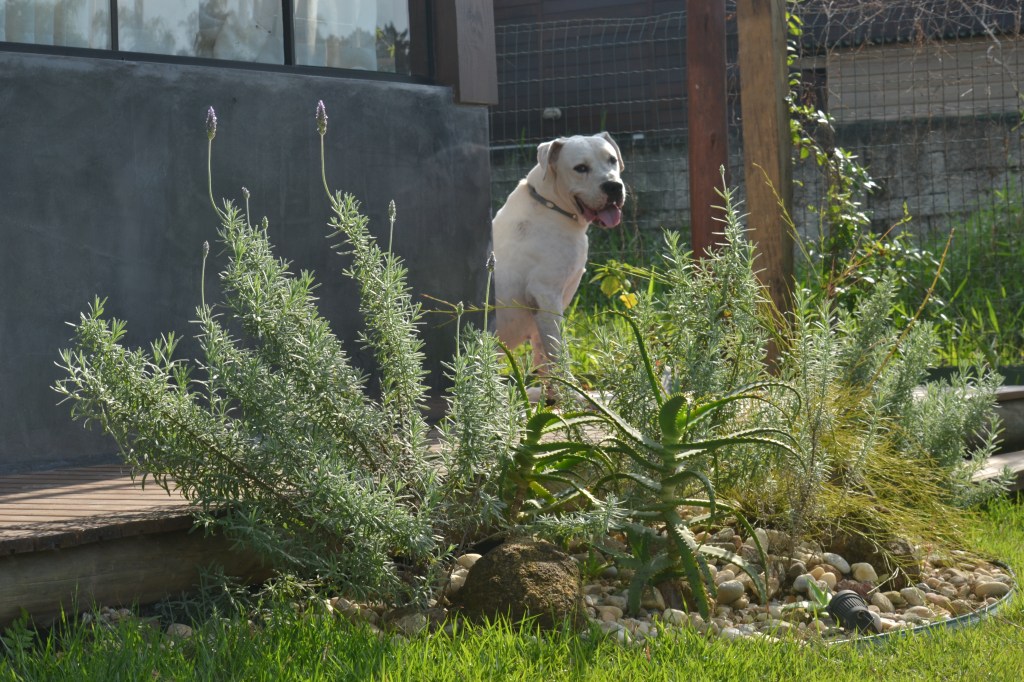 As flores da Petrea vão pendurar no pergolado vistindo o acceso de tons lilas. Junto com o cerco vivo de Malvaviscus, que floresce o ano todo, recibem nos na porta da casa e criam um espaço que nos refugia.